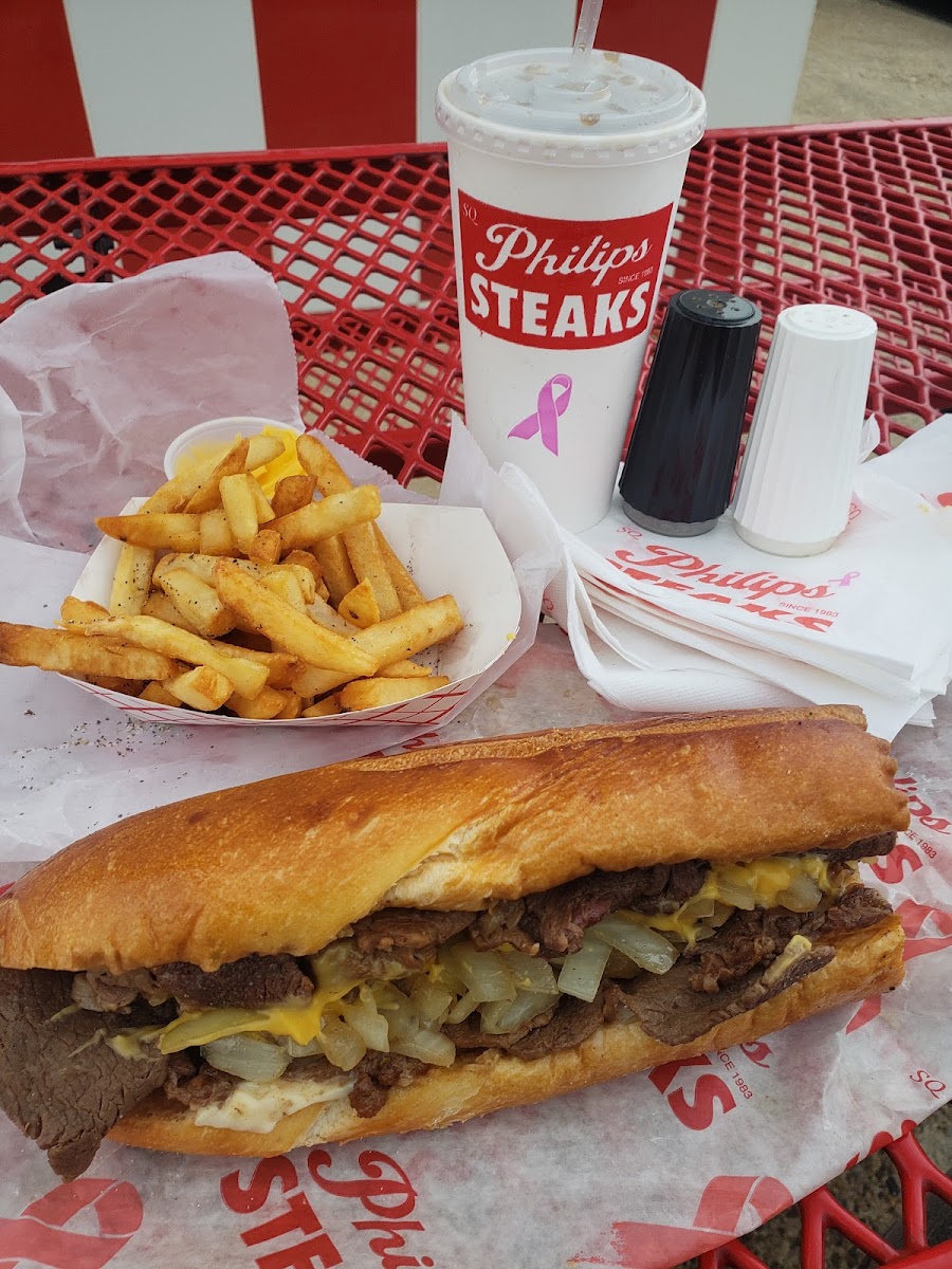This is a highly undervalued and under appreciated Philly landmark. I had a cheesesteak fried onions with American and it was awesome!!! Those other two famous places are tourists traps and suburban crowd. Philips is conveniently located minutes from the Sports Complex on Passyunk and is easy in easy out. Great value as well. Loved Philips. Highly recommend if you are visiting for a sports or concert event.