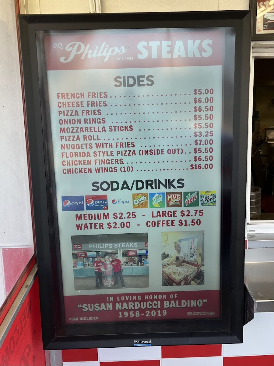 You'll find an array of steak sandwiches featuring the signature Philly cheesesteak, along with variations like mushroom chicken cheesesteaks and hoagies. There are also unique twists like the Inside Out Pizza and Florida Style Panzerottis, bringing a fresh spin to traditional fast food. For something lighter or different, they serve several burger options and a few simple sides, such as vinegary fries or cheese fries, which pair well with their beverage selection including classic sodas and bottled water.